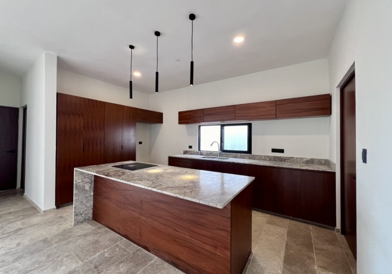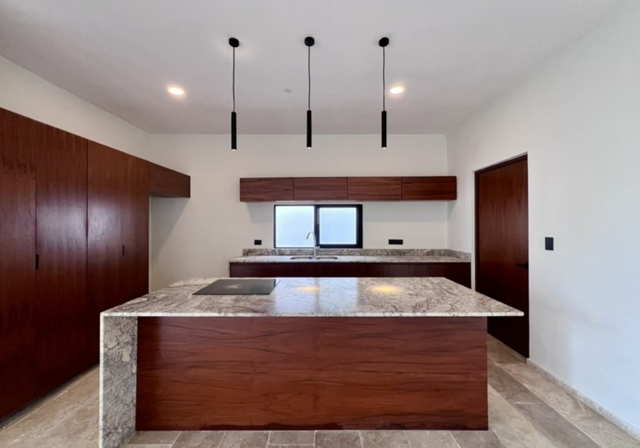 - Cocina integral con isla parrilla horno y gavetas de madera.