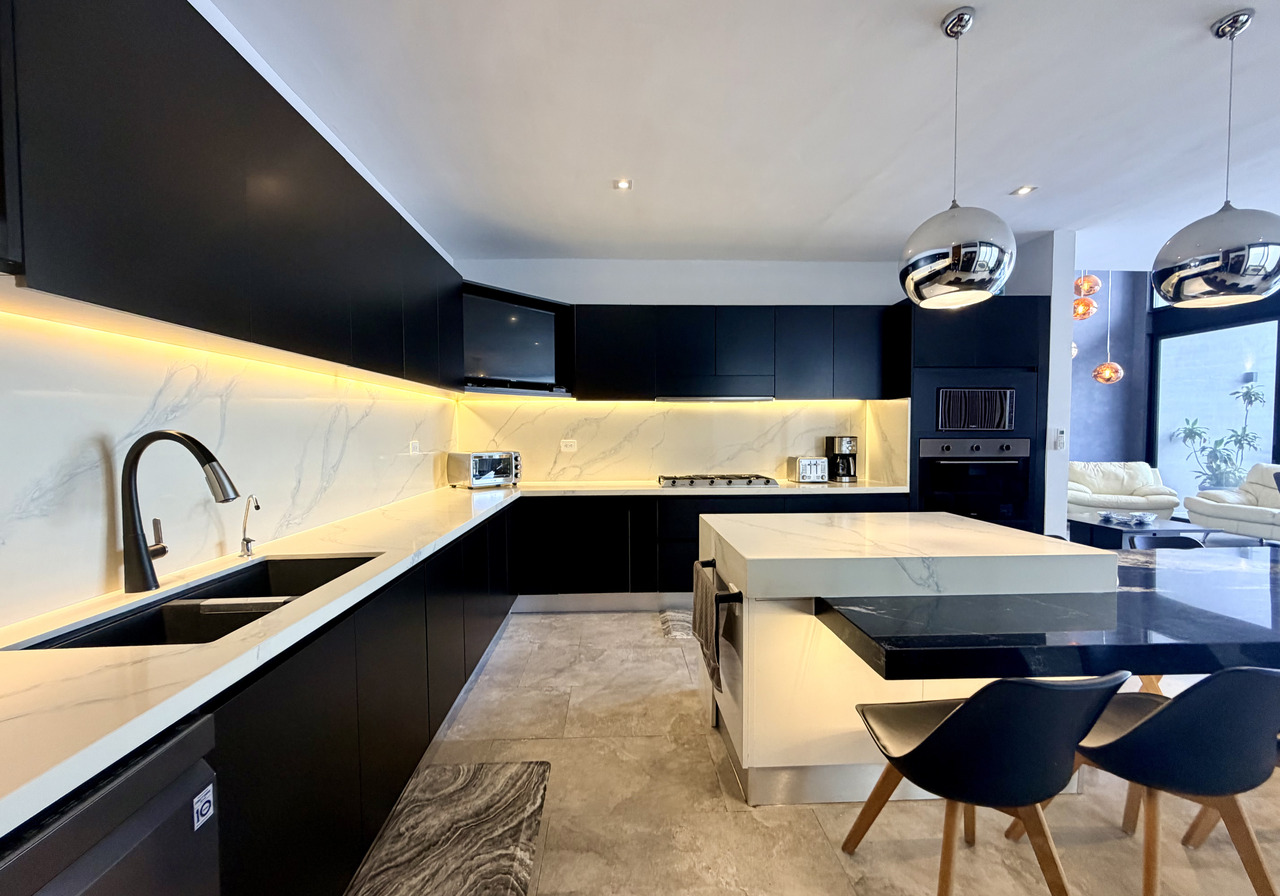 - Cocina con mesetas de cuarzo y mármol negro estelar.